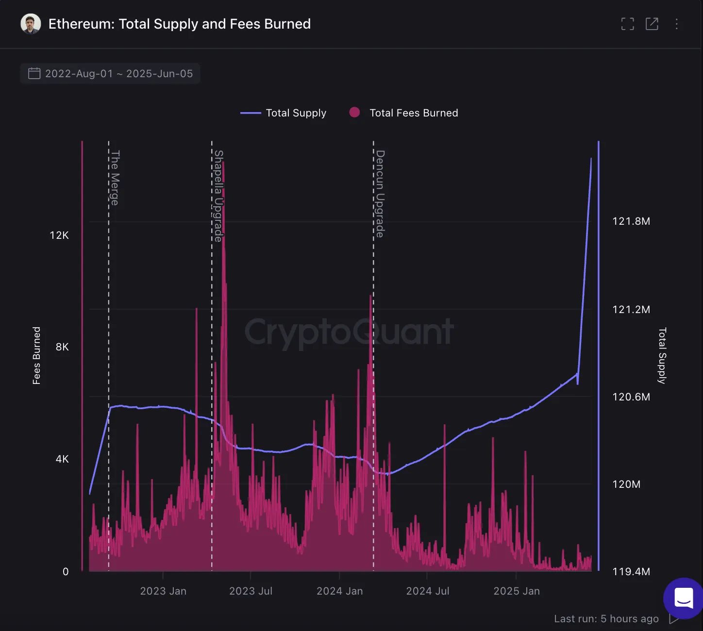 После внедрения Dencun комиссии ETH снизились, скорость сжигания упала, а предложение стало инфляционным, в то время как L2-сети поглотили использование основной сети.
