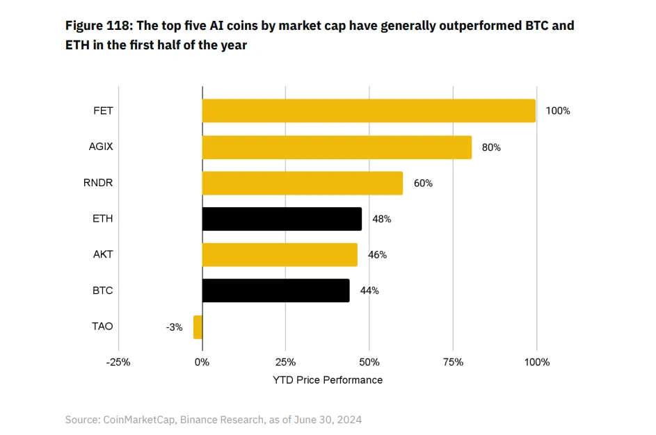 Оседлав поезд шумихи, крупнейшие по рыночной капитализации монеты ИИ в целом опередили BTC и ETH в первой половине года.