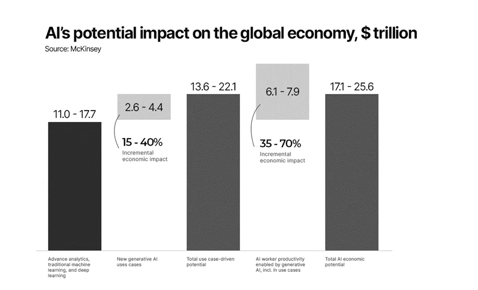 По оценкам McKinsey, общий экономический эффект от ИИ составит 17,1-25,6 триллиона долларов.