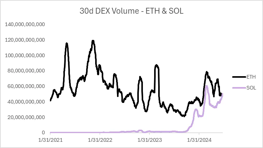 Solana стала самым выдающимся L1 в этом цикле, недавно обогнав Ethereum по 30-дневному объему на DEX.