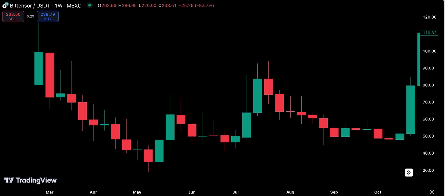 Что касается $TAO, его экосистема продолжает расти, превышая 50 подсетей. Это помогает укрепить позицию Bittensor в пространстве с ощутимыми вариантами использования, которые легко понять участникам рынка. Обратите внимание, что это было не так несколько месяцев назад, когда проект воспринимался как абстрактная идея, которую не многие могли объяснить. Это позиционирует $TAO как лучший прокси для ставок на ИИ и получения признания в кругах Кремниевой долины.