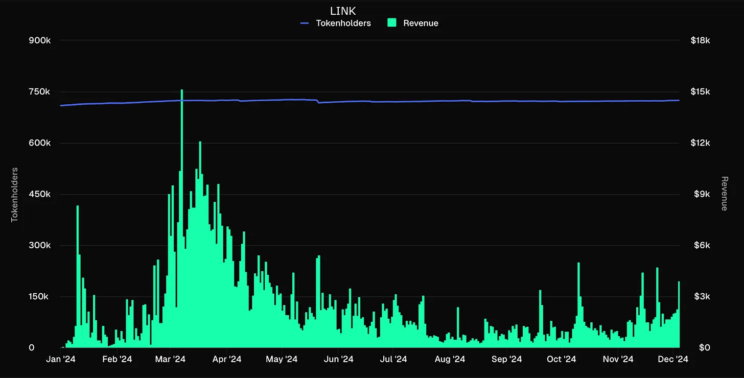 LINK обработал $17,3 Т активов через свою оракловую сеть, но ежедневный доход снизился на ~90% с начала года, а стагнация роста держателей сигнализирует об ограниченном спросе.