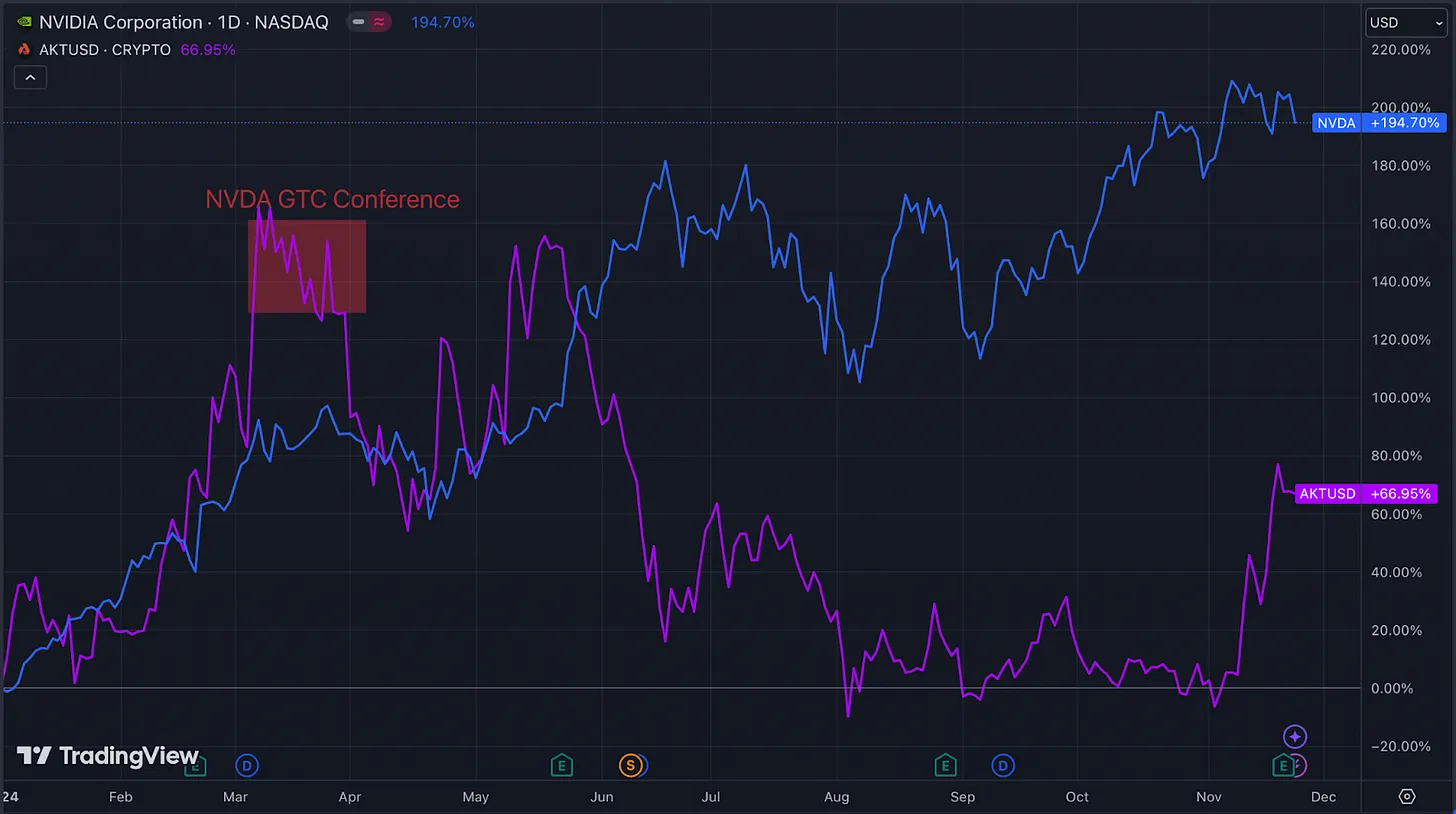 Децентрализованные GPU-сети, такие как AKT, исторически отражают развитие NVDA, как в ценовом движении, так и в реальном влиянии.