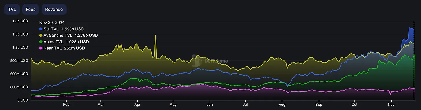 TVL SUI является ключевым показателем растущей популярности этой криптовалюты: несмотря на поздний запуск, она превзошла несколько устоявшихся сетей L1.