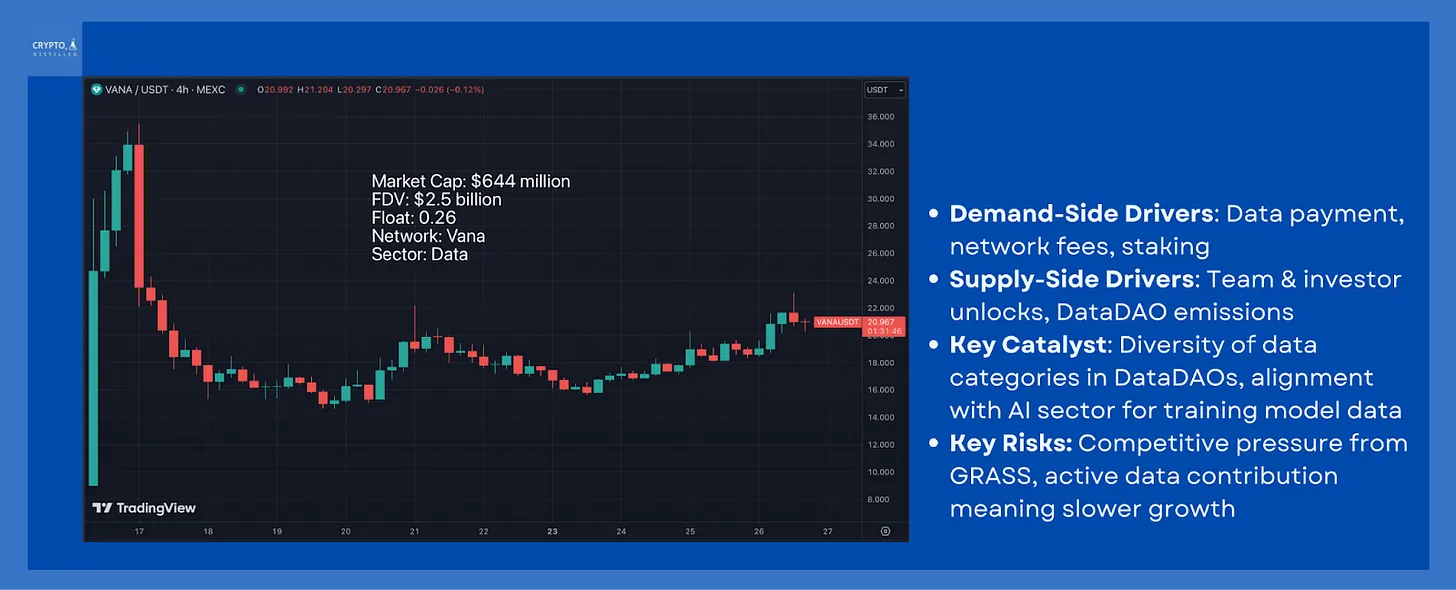 • Платежи за данные: Потребители платят в VANA и сжигают токены DLP, связывая спрос с использованием.