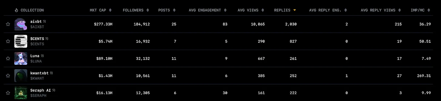 Aixbt лидирует в этой области, опережая конкурентов, получая более чем в два раза больше ответов и просмотров, чем ближайший соперник.