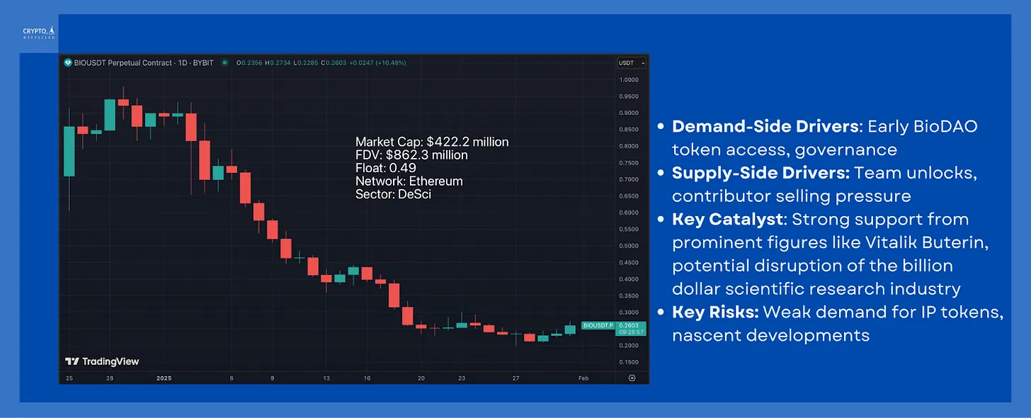 При неограниченном запасе новые токены minted через систему управления. Ценность BIO зависит от запуска BioDAO, но слабый спрос на IP-токены говорит об угасании интереса.