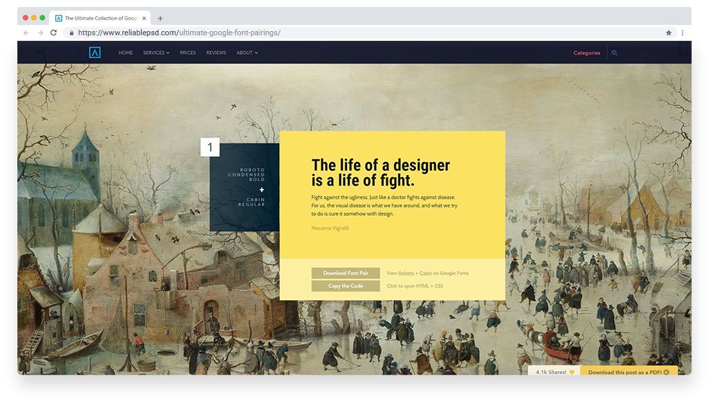 Ultimate google font pairings - огромная коллекция профессионально подобранных шрифтовых пар. Все шрифты доступны в Google Font, и их можно скачать прямо с сайта, либо скопировать HTML код. Особенно удобно для тех, кто пока еще не совсем ладит со шрифтами, и подбором.