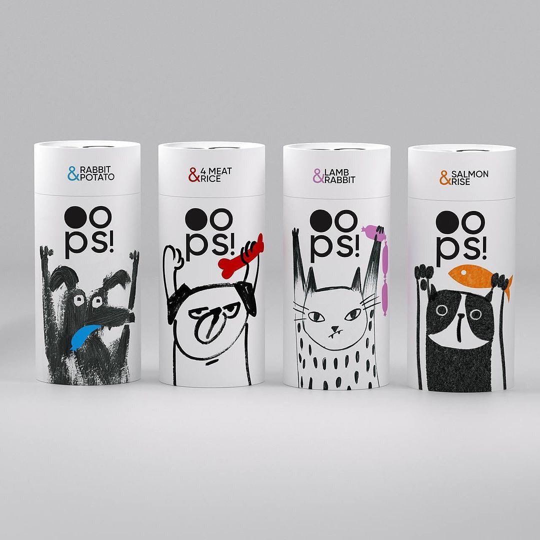 Забавные иллюстрации на корме OOPS! Питомец пойман с поличным, когда хотел взять очередную вкусняшку. Немного разные графические стили для каждого SKU отражают характер, индивидуальность и вкусовые предпочтения каждого животного. Сам вкус лакомства обозначен цветом, что позволяет достаточно быстро ориентироваться, какой товар нужно купить.
