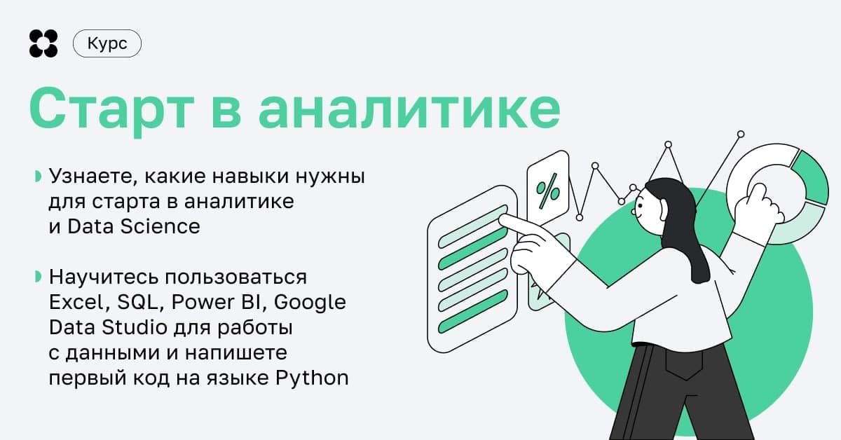 На обзорном курсе «Старт в аналитике» в Нетологии вы получите базовые навыки Data Science и построите план дальнейшего развития. За 9 занятий успеете влюбиться в аналитику и познакомиться с 6 основными инструментами, пощупаете код и активируете data-driven мышление.