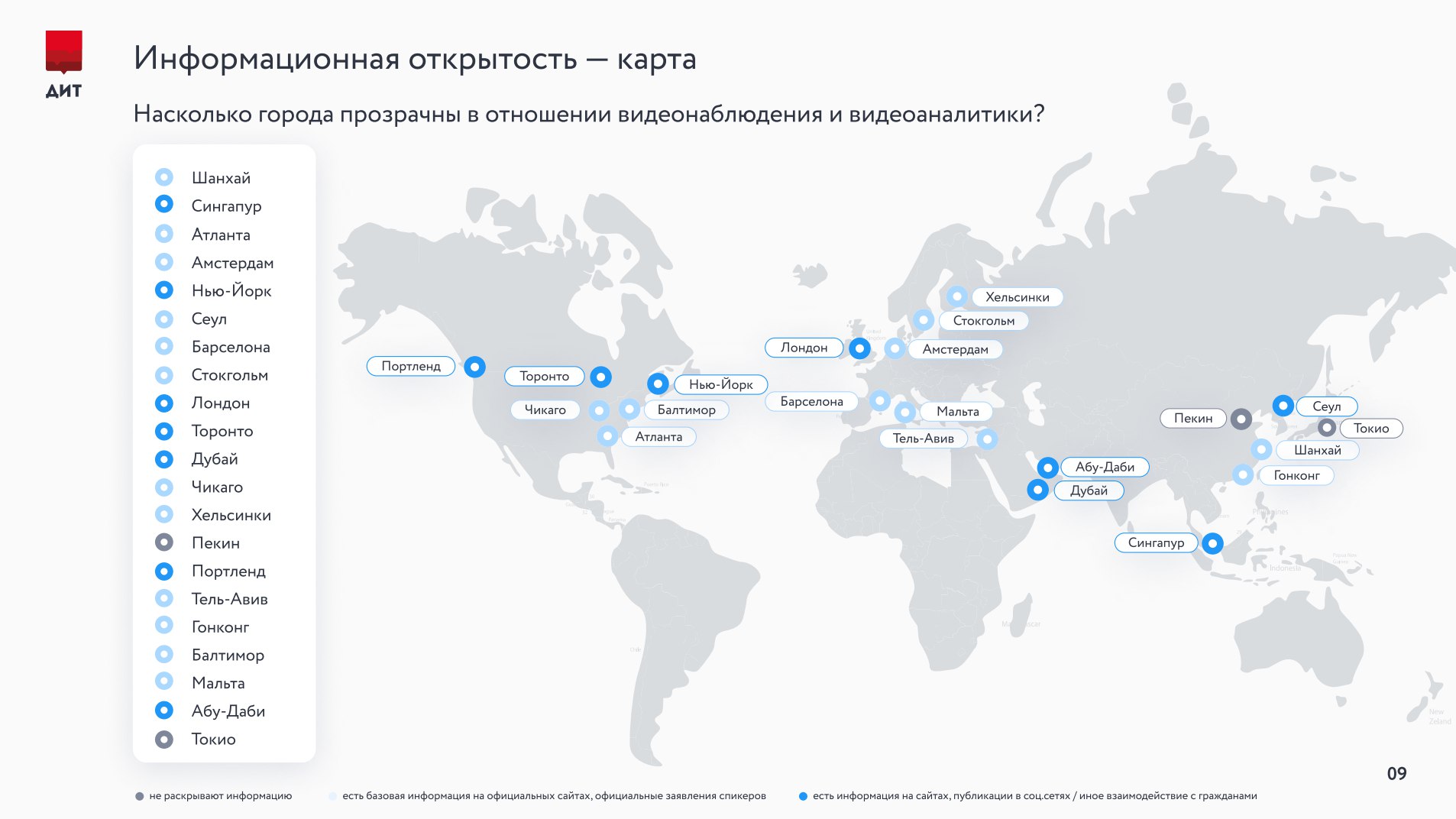 📌 анализ подходов к позиционированию видеонаблюдения, видеоаналитики и отношения жителей в 21 локации, среди которых: Нью-Йорк, Чикаго, Лондон, Амстердам, Хельсинки, Тель-Авив, Гонконг, Сингапур, Пекин, Шанхай, Абу-Даби и др.;