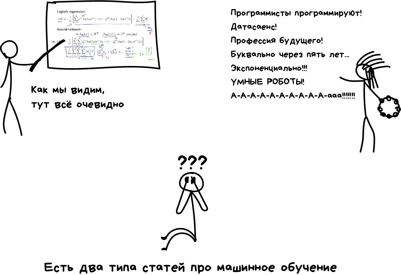 Машинное обучение — как секс в старших классах. Все говорят о нем по углам, единицы понимают, а занимается только препод. Статьи о машинном обучении делятся на два типа: это либо трёхтомники с формулами и теоремами, которые я ни разу не смог дочитать даже до середины, либо сказки об искусственном интеллекте, профессиях будущего и волшебных дата-саентистах.