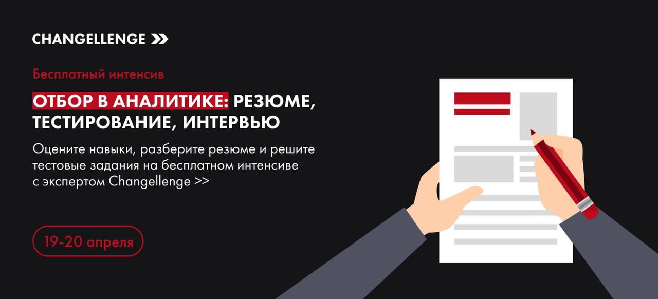 Последний шанс зарегистрироваться на бесплатный интенсив «Отбор в аналитике: резюме, тестирование, интервью» 19-20 апреля в 19:00 Мск
