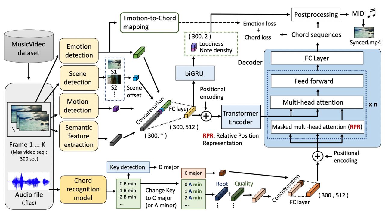 Эта платформа уникальным образом использует функции видео в качестве входных данных для создания соответствующей музыки с использованием архитектуры Transformer.