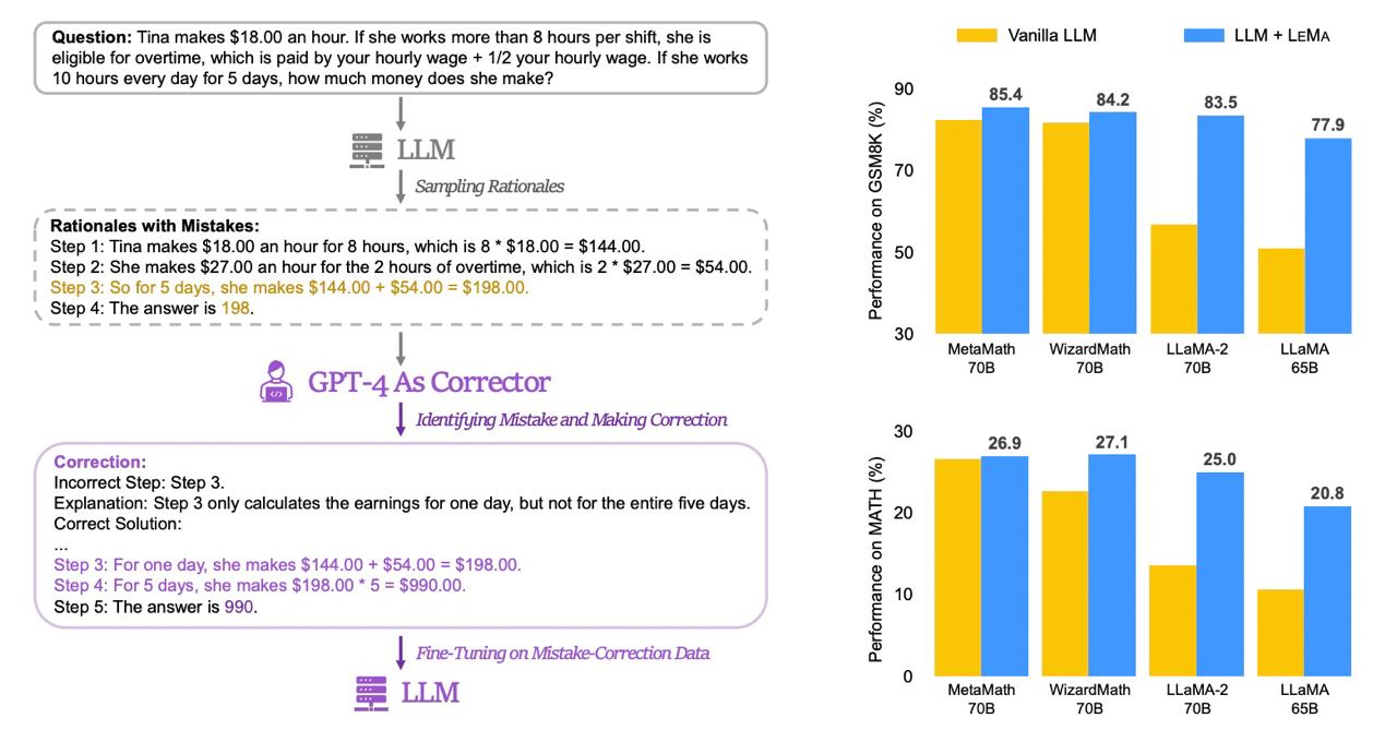 Имитируя этот процесс обучения, основанный на ошибках, LEMA точно настраивает LLM на парах данных для исправления ошибок, сгенерированных GPT-4.