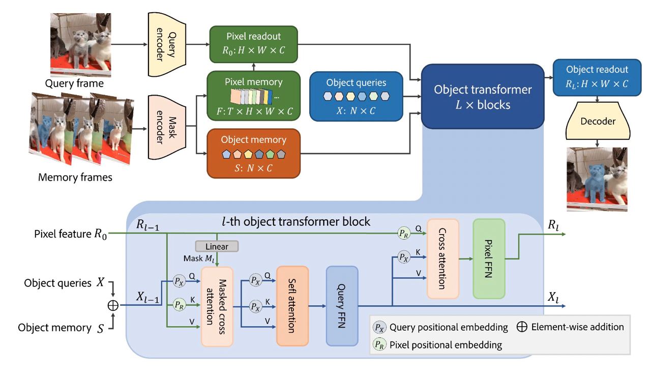 Cutie выполняет чтение памяти на уровне объектов сверху вниз, адаптируя небольшой набор объектных запросов для реструктуризации и итеративного взаимодействия с восходящими пиксельными функциями с помощью преобразователя объектов на основе запросов.