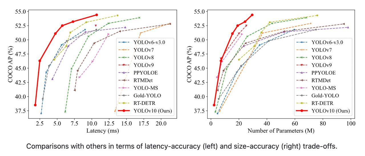 По сравнению с YOLOv9-C, YOLOv10-B имеет на 46% меньшую задержку и использует на 25% меньше параметров при той же производительности.