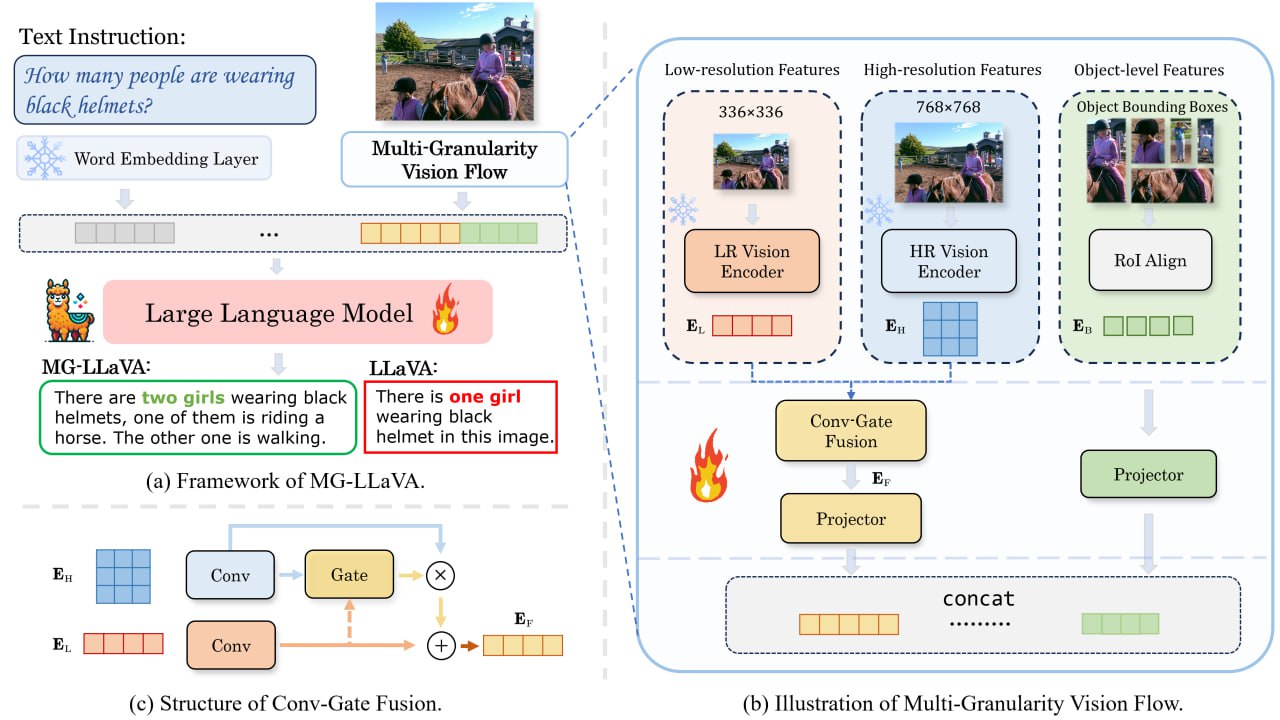 MG-LLaVA, инновационная MLLM, которая расширяет возможности визуальной обработки модели за счет включения многоуровневого потока визуализации, который включает в себя функции низкого разрешения, высокого разрешения и объектно-ориентированные функции.