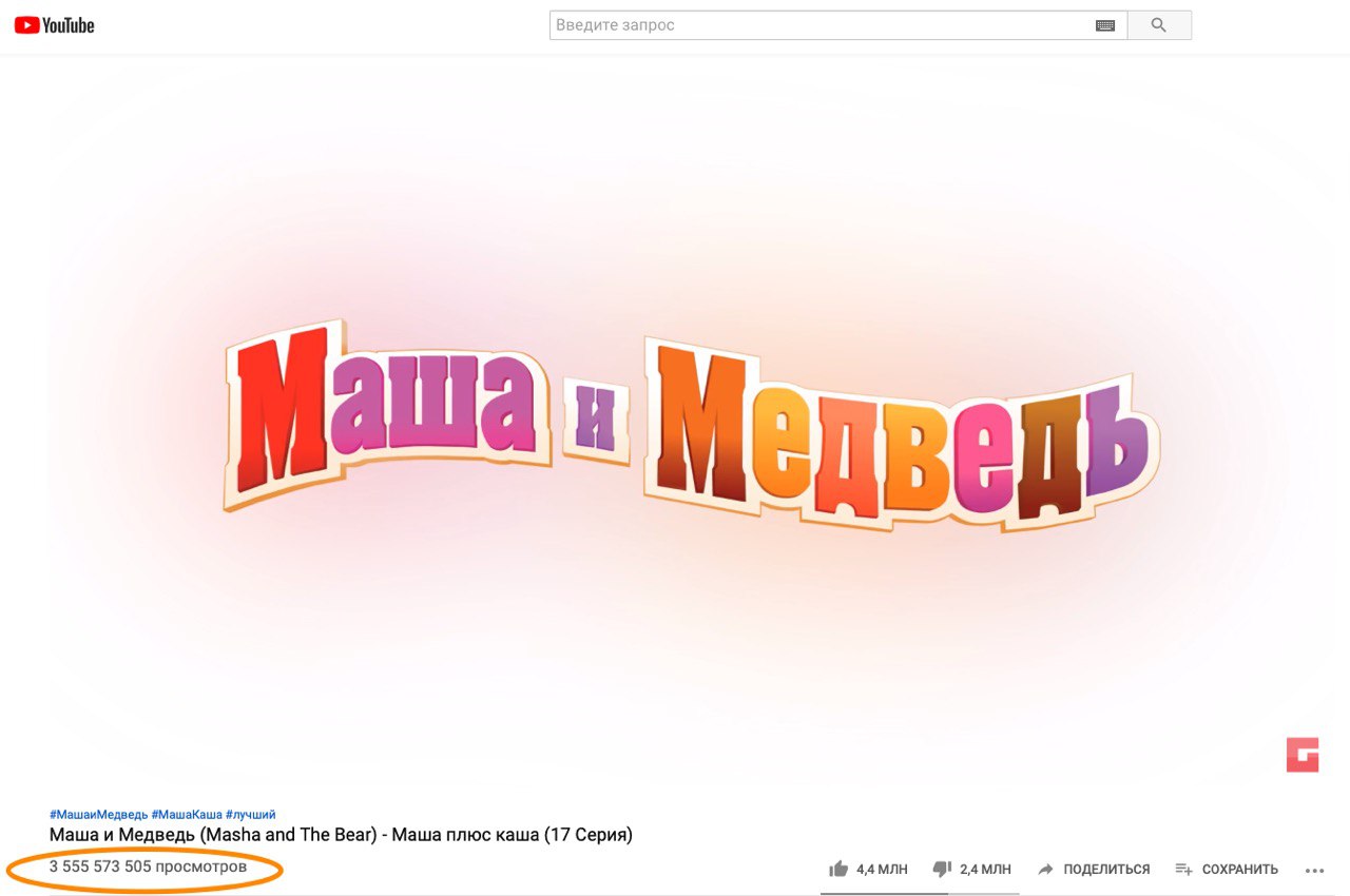 Эпизод мультфильма «Маша и Медведь» — «Маша плюс каша», стал самым просматриваемым анимационным роликом на YouTube и был занесен за это в Книгу мировых рекордов Гиннесса.