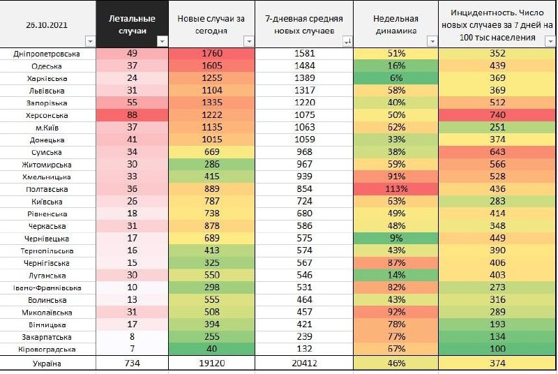 Найбільша кількість летальних випадків була зафіксована у Херсонській області — 88, Запорізькій — 55, Дніпропетровській — 49. Зростання за тиждень +36%. Нових випадків — 19120, зростання за тиждень +46%.