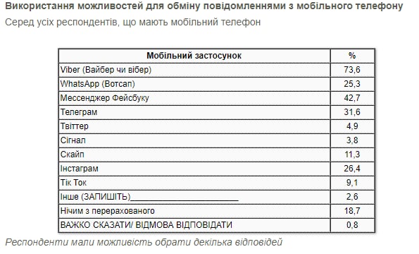 КМІС провів опитування щодо найбільш популярних месенджерів. Виявилося, що найбільш поширеним засобом для комунікацій є Viber, яким користується 73,6% опитаних. Далі йде Мессенджер Фейсбуку – 42,7%. На третьому-четвертому місцях знаходяться Telegram (31,6%) та WhatsApp (25,3%). Статистична похибка вибірки не перевищує: 2,4% для показників, близьких до 50%, 2,1% для показників, близьких до 25%.