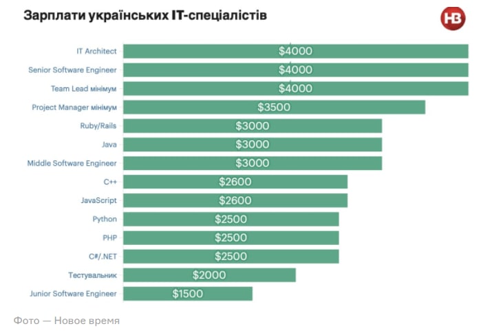 Зарплати IT-спеціалістів в Україні знаходяться у діапазоні від $1 500 у Junior software engineer до $4 000 у Team lead та Senior software engineer. Середня тривалість роботи співробітника в IT-компанії в Україні становить від 3 до 5 років. Більше про рейтинг зарплат українських програмістів у порівнянні з Європою та США тут.