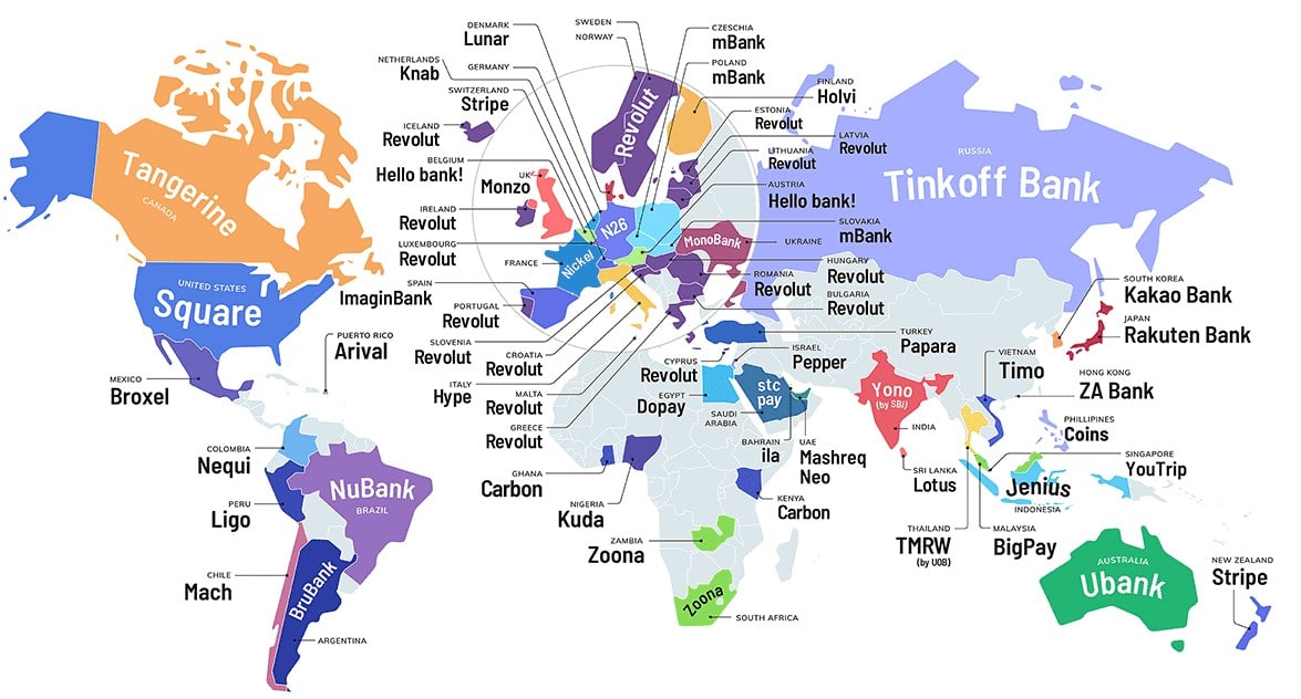 Видання Business Financing проаналізувало пошукові запити в Google і визначило, якими необанками користувачі з різних країн цікавляться найбільше. У США найпопулярнішим є Square з 719 тис. запитів на місяць, у Великій Британії — Monzo (237 тис.). Revolut посідає першу сходинку в 17 країнах. Найпопулярнішим необанком України став Monobank.