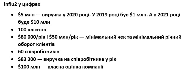 Стартап Influ2 нещодавно залучив $8 млн. Тепер співзасновник проєкту Дмитро Лисицький вперше назвав оцінку компанії — $100 млн. Сервіс Influ2 підприємець запустив влітку 2017 року. Ідея його полягає у тому, щоб таргетувати рекламу на конкретних людей, з урахуванням того, як і скільки разів вони взаємодіяли з нею. Дмитро Лисицький розповів про те, як обирати ідею стартапу, де легально купити персональні дані за долар та чому не можна пускати у борд українських інвесторів.
