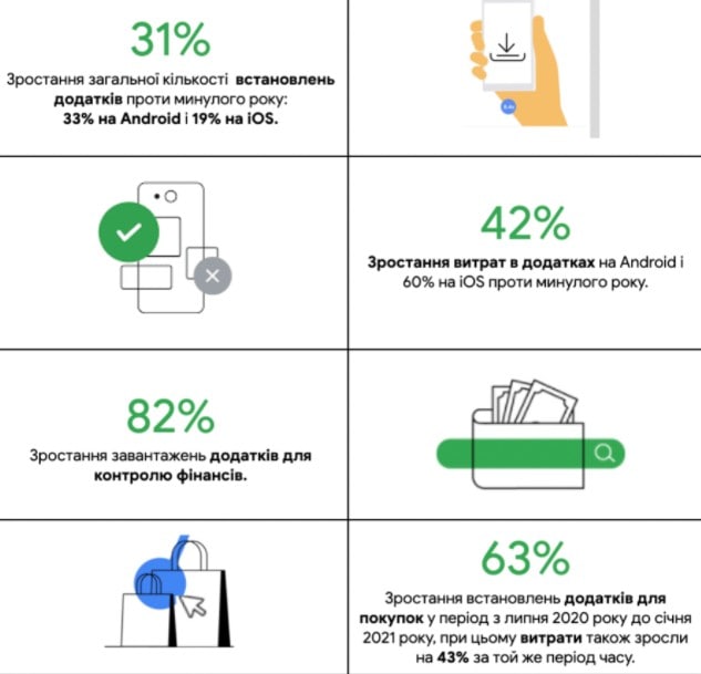 За результатами дослідження компанії AppsFlyer спільно з Google, загальна кількість встановлень додатків в Україні зросла на 31%, а витрати на них — на 42%. Кількість встановлень програм на Android збільшилася на 33%, а на iOS на 19%. Оскільки COVID-19 змінив способи взаємодії споживачів із банками, дослідження показало зростання в Україні встановлень застосунків для контролю особистих фінансів — на 82%. Дохід від реклами у додатках зріс на 288%.