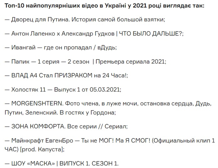 Лідером за кількістю переглядів в Україні стало розслідування Олексія Навального «Дворец для Путина. История самой большой взятки», йдеться у звіті YouTube. Серед авторських відео 2021 року українські користувачі більше дивилися інтерв’ю відомих людей, а також телевізійні шоу, серіали та розважальний контент.