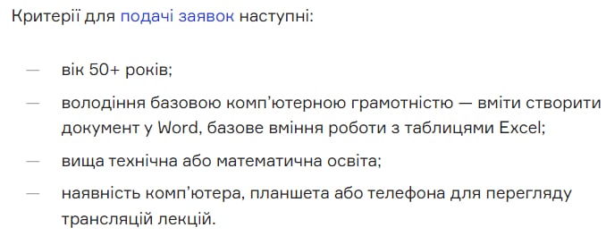 Фонд «Жизнелюб» разом з IT-компанією UNITY-BARS та навчальним центром DAN IT education запускають безкоштовний онлайн-курс для літніх людей. Долучитися до нього зможуть люди старше 50 років з базовими комп’ютерними навичками та технічною можливістю дивитися трансляції лекцій. Найкращих студентів затвердять на базові курси з обраних професій, а потім — працевлаштують. Подати заявку можна тут.