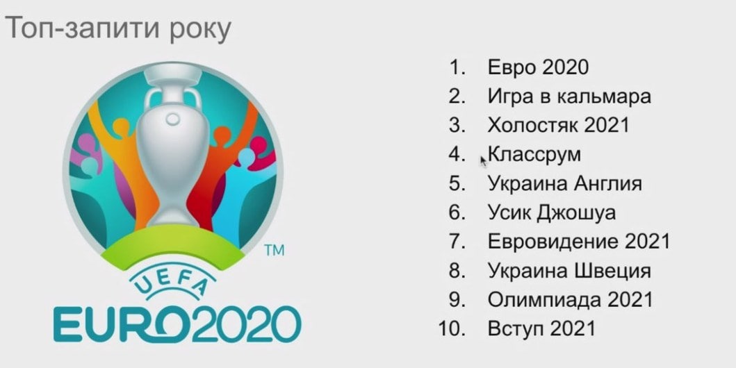 Глобальний пошуковик оприлюднив топ запитів українців у 2021 році. Серед відповідей виявилося багато несподіванок. У топ пошуків потрапили Євро-2020, серіал «Гра в кальмара» і шоу «Холостяк 2021». Серед персон найчастіше шукали Олександра Усика та Олексія Навального. В топі пошуків є навіть кілька російських серіалів.