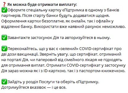 Співзасновник monobank Олег Гороховський заявив, що необанк починає відкривати карти для одержання вакцинованими клієнтами 1000 гривень від держави. Для цього треба оновити програму і у верхньому меню, там, де вибір карт, натиснути «Відкрити карту». Далі треба вибрати карту «єПідтримка». «Відкрити карту можна буде із повідомлення у виписці, яке ми вам надішлемо. Держава планує розпочати виплати 19 грудня», — зазначив Гороховський. Для виплати обов'язково має бути встановлений додаток «Дія».