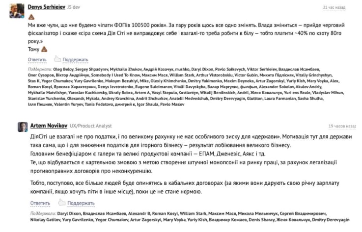 На IT-ресурсі DOU розгорілася велика дискусія під новиною про прийняття у другому читанні закону про запуск Дія City. Більше побоювань у рядових айтішників викликає той факт, що влада в Україні часто змінюється, і Дію City можуть визнати такою, яка не виправдовує себе. А всіх, хто на неї перейшов, — зобов’яжуть платити податки на загальних умовах. Ще одне побоювання виглядає так: Дія City — це потенційна монополія на робочу силу в особі держави.