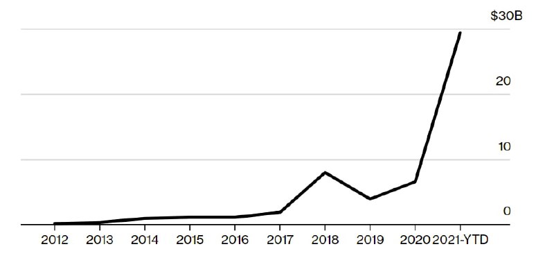 У 2021 році фонди інвестували в криптовалюту майже $30 млрд, що більше, ніж за всі попередні роки разом узяті. Цьогорічний рекорд майже в чотири рази перевершив попередній максимум, який становив $8 млрд у 2018 році, пише Bloomberg. Відомі фірми, такі як Coinbase Ventures, Digital Currency Group і Polychain Capital, почали вкладатися і в експериментальні проєкти, наприклад, додатки для соцмереж, які перетворюють знаменитостей на токени.