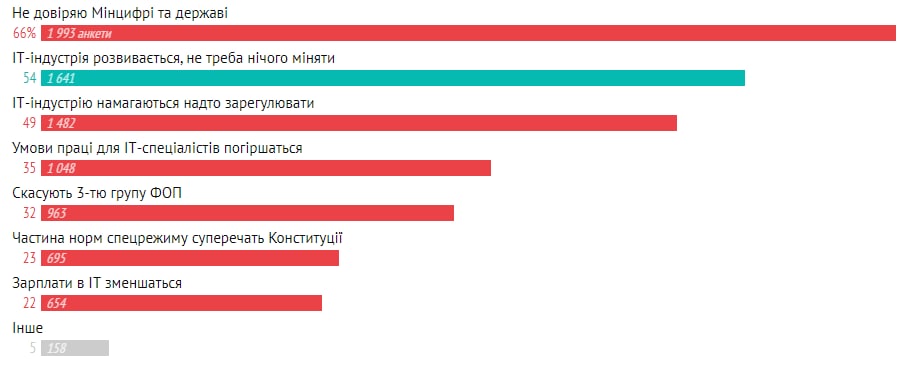 У дослідженні колег з DOU щодо «Дія City» взяли участь майже 4000 спеціалістів. 80% айтішників досі проти. Чверть з них збирається звільнитися у разі вступу в «Дія City». Знизилася частка тих, хто не підтримує через недовіру до Мінцифри — з 77% до 66%. Серед інших варіантів респонденти згадували про погану реалізацію проєкту, необхідність податкової реформи, кінець для дрібних компаній та статтю про неконкуренцію.