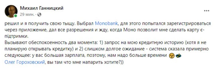 Шеф-редактор інформаційної агенції УНІАН Михайло Ганницький хотів оформити «вовину тисячу» за повний курс вакцинації. Він обрав Monobank, який обіцяє швидку виплату. Але в банку виплату затягнули, сказавши, що у редактора велика зарплата, а ще запросили його кредитну історію. За словами Ганницького, система сказала приблизно наступне: у вас велика зарплата, тому нам треба більше часу.