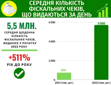 За даними голови податкового комітету ВР Данила Гетманцева, з початку року середня кількість фіскальних чеків, що видаються за день, сягнула 5,5 млн штук. Рік до року цей показник підвищився на 4,6 млн (+511%). «Більше 250 000 РРО/ПРРО зареєстровано фізичними особами-підприємцями», — написав також нардеп у Telegram.