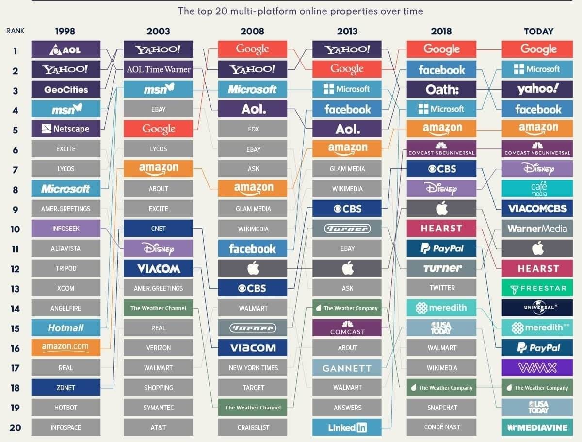 Google, Amazon, Facebook не завжди були найпопулярнішими сайтами в глобальній павутині. До 2003 року вони навіть не входили в топ порталів за кількістю відвідувань. На початку 2000-х найсильніші позиції займали Yahoo та AOL, слугуючи для мільйонів користувачів «вікном» в інтернет. Картинка про те, як росли найбільші інтернет-гіганти продовж двох з половиною десятиліть.