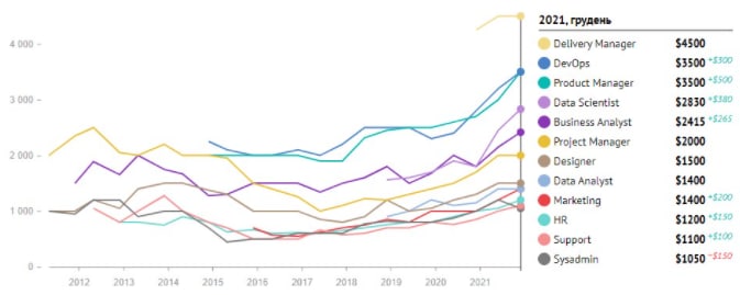 Зарплати українських IT-фахівців — як технічних, так і нетехнічних спеціальностей — продовжили зростати. За останні пів року найбільш активно зростали зарплати таких спеціальностей: Product Managers (+500 до $3500), фахівців з Data Science (+$380, до $2830), DevOps (+$300, до $3500), Business Analysis (+$265, до $2415), маркетинг (+$200, до $1400). Почали збільшуватися і зарплати HR-фахівців (+$150, до $1200).
