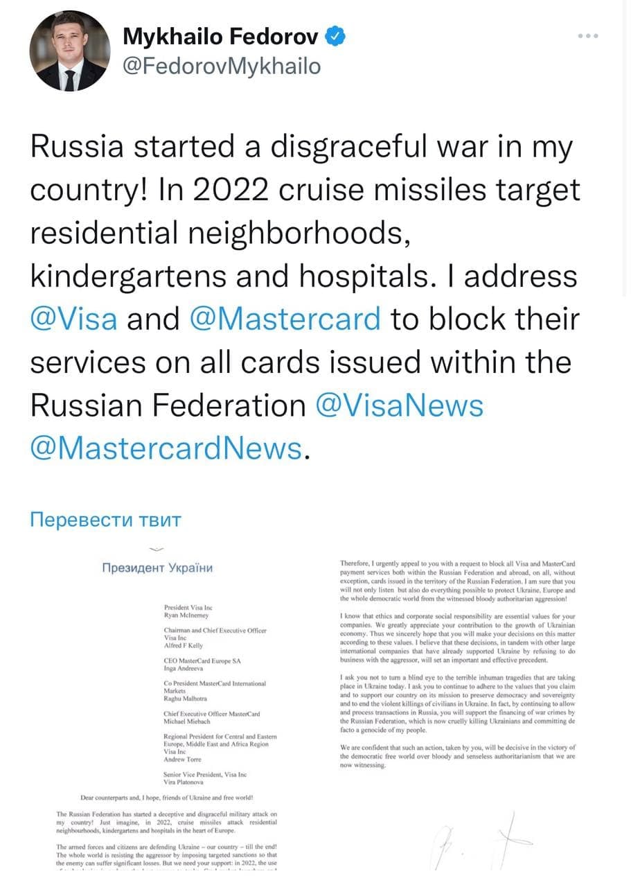 Міністр цифрової трансформації України Михайло Федоров звернувся до всіх світових криптобірж з проханням заблокувати користувачів з Росії та Білорусі. «Важливо заморозити не тільки рахунки політичного керівництва Росії та Білорусі, але й всіх громадян», — зазначив міністр.