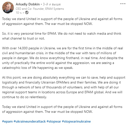 CEO EPAM Аркадій Добкін опублікував пост в соцмережі LinkedIn, де висловився проти війни в Україні. Він підтримав нашу країну та виступив проти будь-яких форм агресії. «Війну треба зупинити ЗАРАЗ», — заявив Добкін. В українському підрозділі EPAM працює більше 14 000 спеціалістів. Він також зазначив, що компанія надає всебічну допомогу українським співробітникам та їхнім сім’ям.