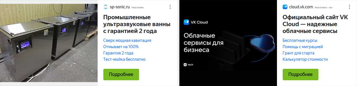 В B2B-рекламе подавляющее большинство баннеров — текстово-графические (92%). И это не случайно: здесь всё работает на ясность, а не на эмоции. В топе по OTS (opportunity to see) — креативы, где пространство почти полностью отдано тексту с техническими деталями. Главная задача — чётко объяснить, что за продукт, почему он лучше аналогов и чем подтверждена экспертность бренда. Например, на баннере компании “СпецмашСоник” заголовок «Промышленные ультразвуковые ванны с гарантией 2 года» сразу доносит суть продукта и ключевое преимущество. А под заголовком — короткие, но весомые тезисы: «Сверхмощная кавитация», «Отмывает на 100%», «Тест-мойка бесплатно».