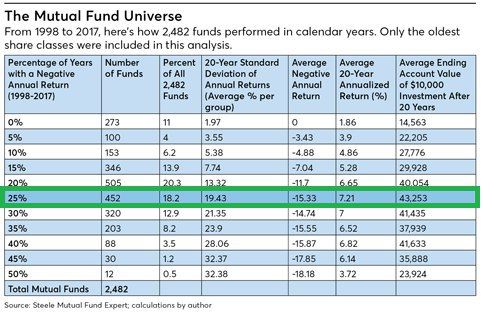 Но насколько частыми и глубокими могут быть эти потери, прежде чем риски больше не будут приносить выгоду? Анализ инвестиционных фондов за последние 20 лет показывает, что риски на уровне 19.5% годового стандартного отклонения и 25% убыточных лет принесли максимальный доход, тогда как отдача от фондов с более высоким (и более низким) риском была ниже.