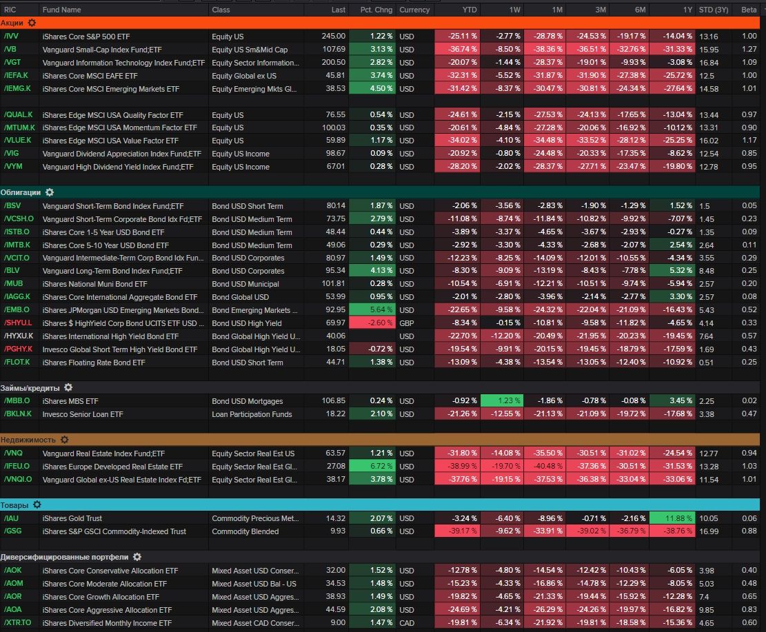 Динамика глобальных классов активов. Мы дополнили список портфелями займов/кредитов (ипотечные займы чувствуют себя в этот кризис совсем неплохо) и диверсифицированными портфелями по отношению к риску и целям инвестиций. Консервативные портфели в долларах с начала года теряют чуть более 12%. Агрессивные - почти 25%.