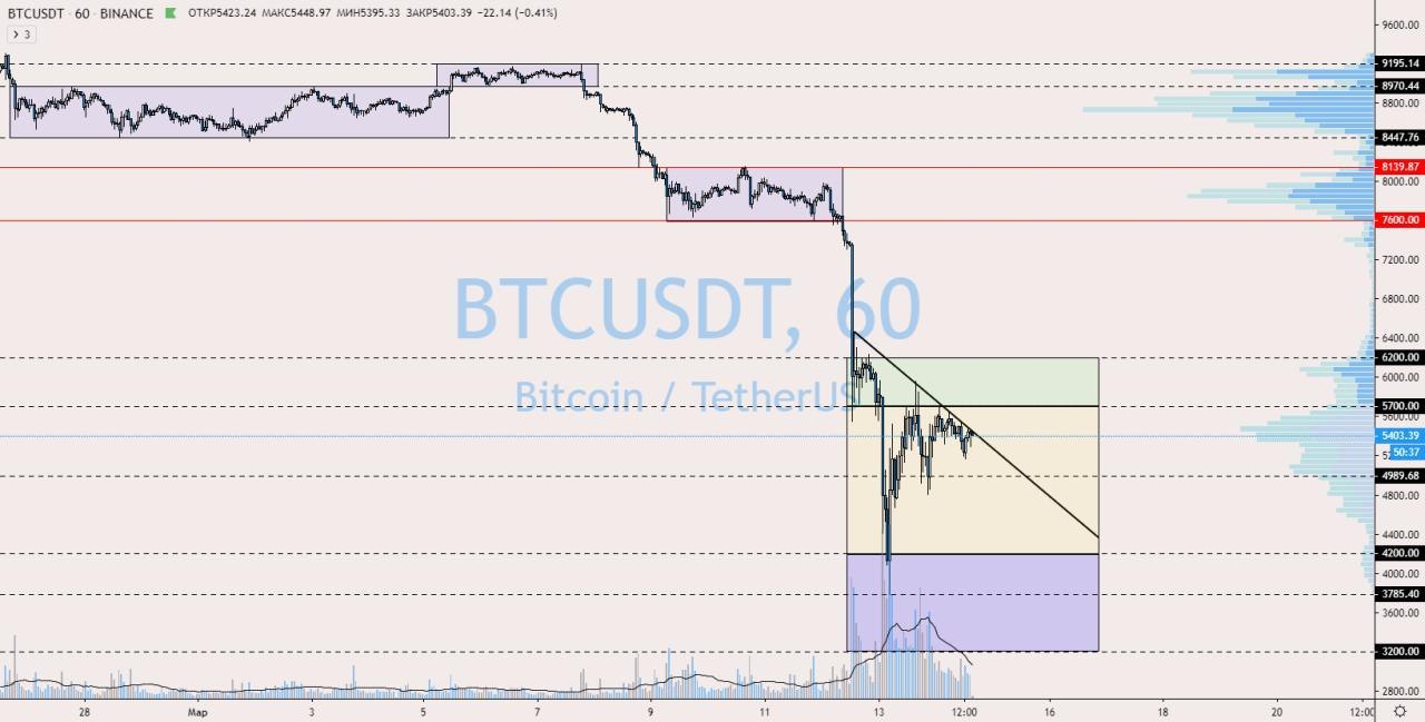 На дневном таймфрейме есть лишь одна актуальная зона 3200-4200 (проторговка зимы 2018-19), которая по факту нас и сдержала + экстренное отключение биржи Bitmex, ордера ликвидаций на которой не позволяли лонгистам выкупить падение. Ниже этой зоны можем лететь без тормозов и никакой ТА не поможет вам определить уровни остановки