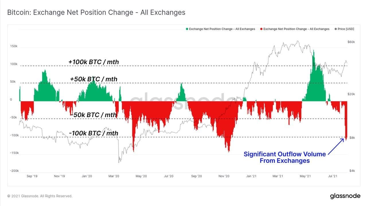 Согласно отчету Glassnode от 2 августа, отток биткоина подошел к уровню 100,000 BTC в месяц.