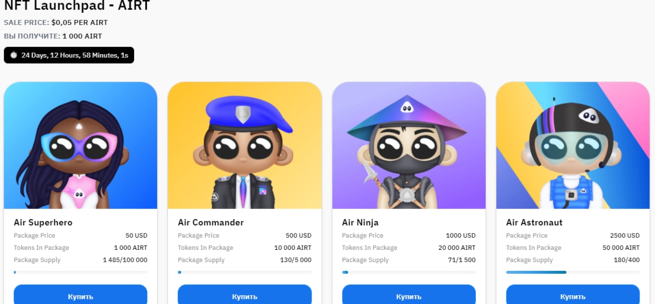🌟Сейчас проходит лаунчпад, в которым вы можете купить 1 из 4 NFT за $50/500/1000/2500 и по окончанию получить саму нфт + токены AIRT по цене присейла $0.05 в соответствии с купленной нфт. Т.е по сути это обычный токенсейл, в котором для участия вам не нужно выигрывать аллокацию, не нужно заранее регистрироваться - просто в моменте купили пак и потом получили NFT + токены.