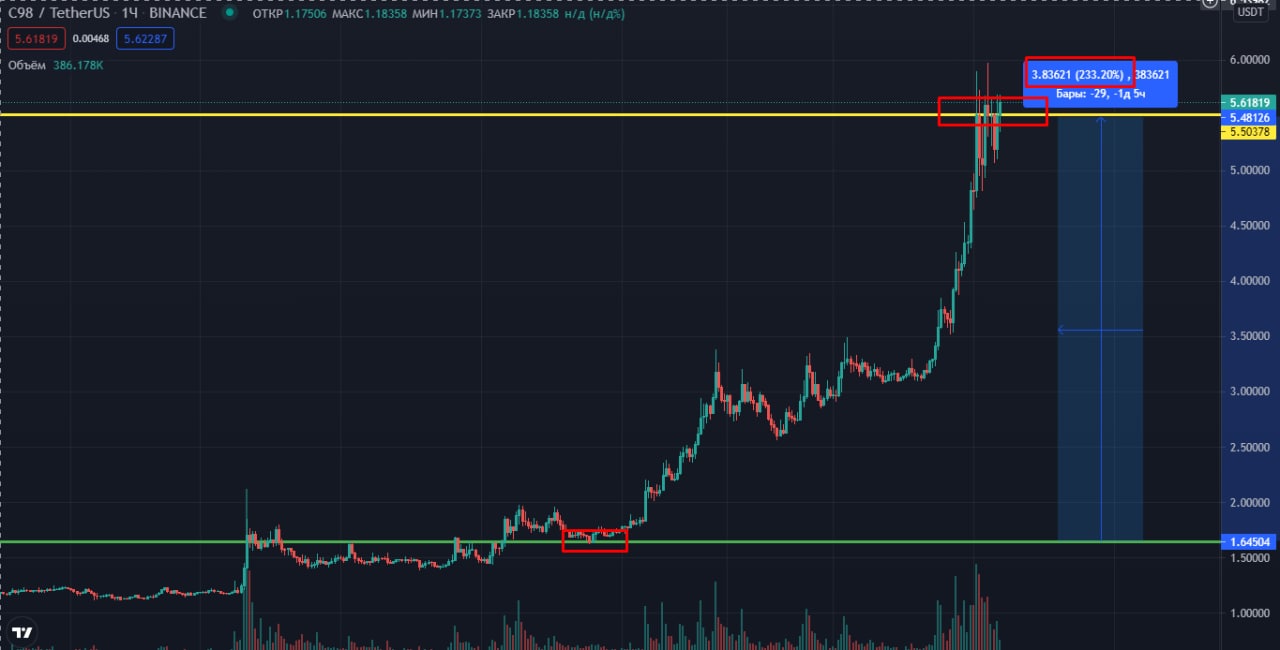 ⚡️C98 - бешенный рост, сегодня цена за монету превысила отметку $6, на $5.5 мы закрыли 100% позиции с 230% профитом