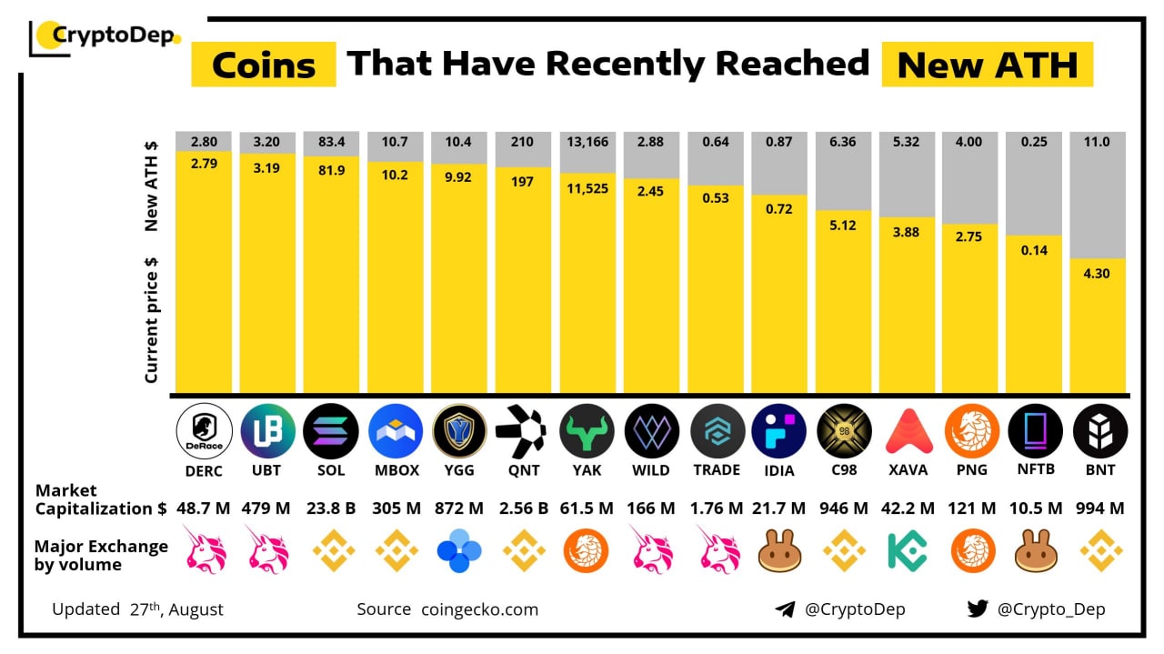 📊Данные составлены на 27 августа, некоторые монеты не остановились на отметках, указанных в графике и продолжили свой рост.